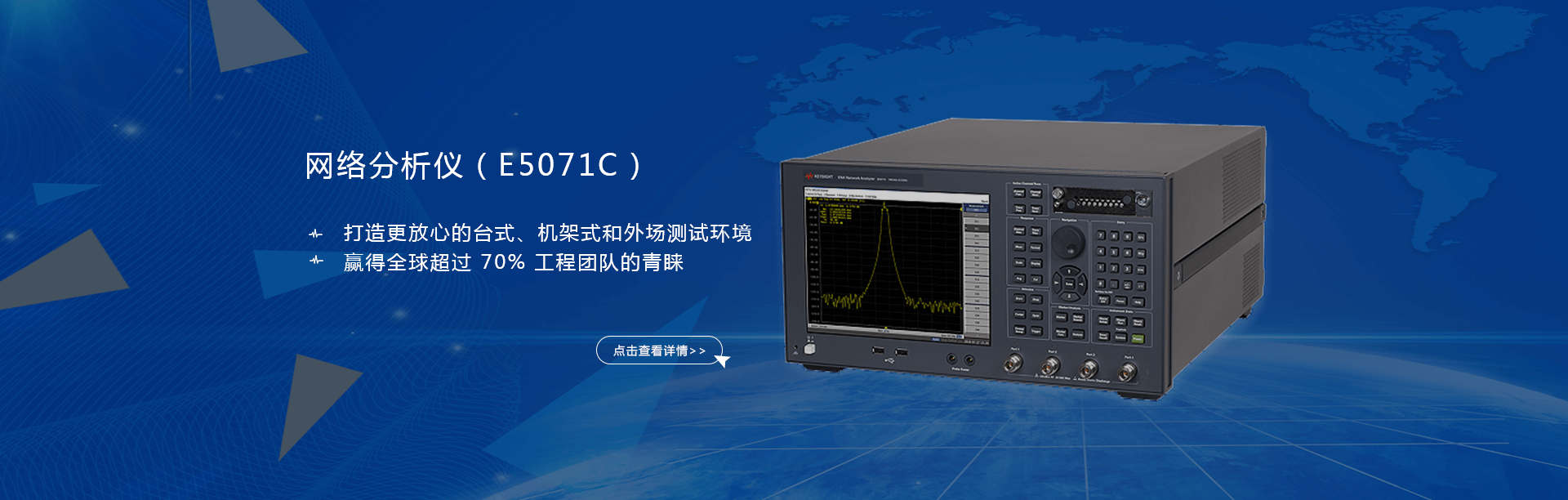 主要產品有:頻譜分析儀,網絡分析儀,綜合測試儀,藍牙wifi測試儀,噪聲系數(shù)測試儀,接收機,電話測試儀,高、低頻信號源,音、視頻信號分析儀,高精度萬用表, LCR/ 電橋、各種通信電源等。經營的儀器品牌主要有:Keysight/Agilent (惠普 / 安捷倫)、 R/S (羅德 & 施瓦茨)、 Anritsu (安立)、Litepoint、 FLUK( 福祿克 ) 、 TEK (泰克)等。
